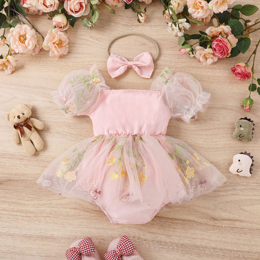 Multi-color Embroidered Skirt Lace Mesh Onesie With Headband