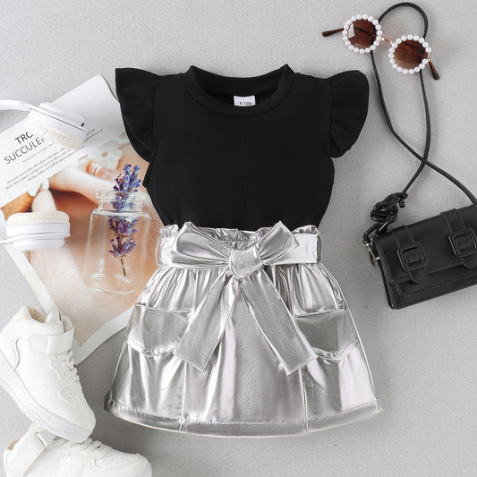 Girls' Summer Black Top Silver Skirt With Belt 2pc Set