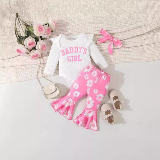 Baby Girl Cartoon Animal Flower Bell-bottom Pants Long Sleeve Headdress Three-piece Set