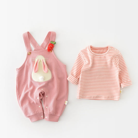 Infant Fashionable Cartoon Bunny Suspender Pants Baby Striped T-shirt Two-piece Set
