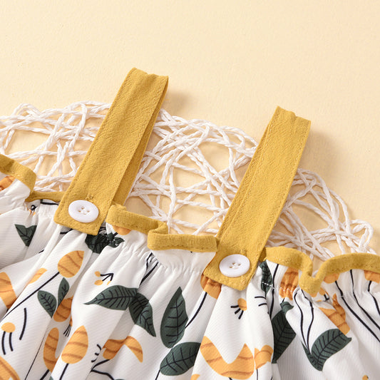 Girls' Flounced Sleeve Printed Strappy Bow Pleated Skirt Two-piece Set
