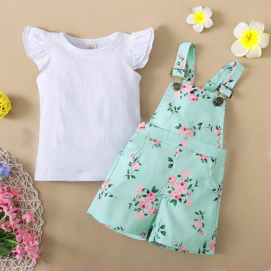 Short Sleeve Flounced Sleeve T-shirt Floral Suspender Pants Suit