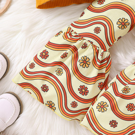 Girls' Knitted Sling Backless Tube Top & Wave Flower Bell-bottom Pants 2pc Suit