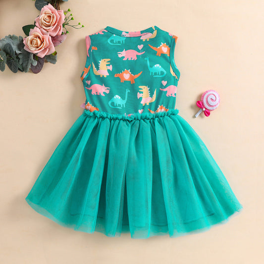 Girls Dress Dinosaur Printed Mesh Bow