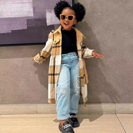 Girls' Plaid Brushed Long Cardigan