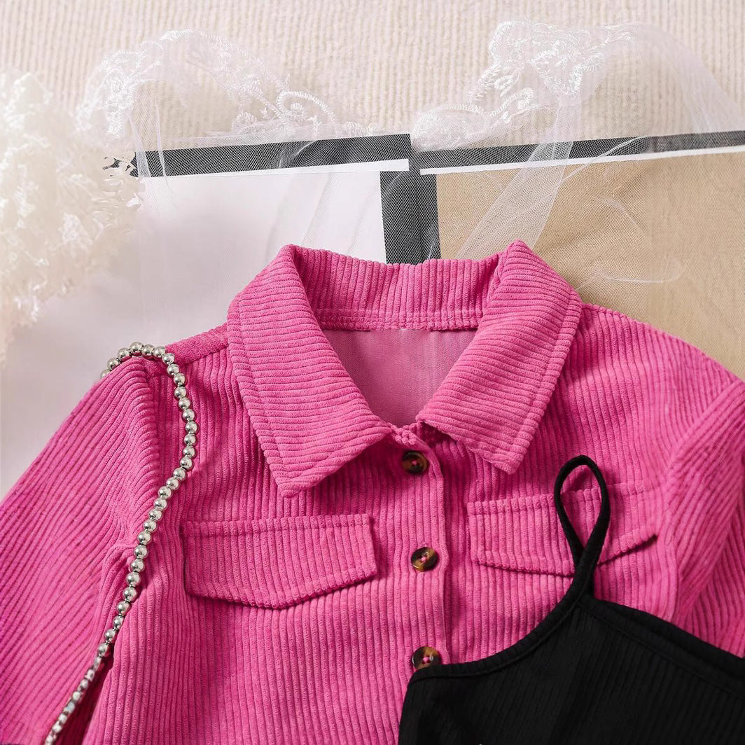 Girls' Spring Autumn Corduroy Short Skirt Sling Three-piece Set