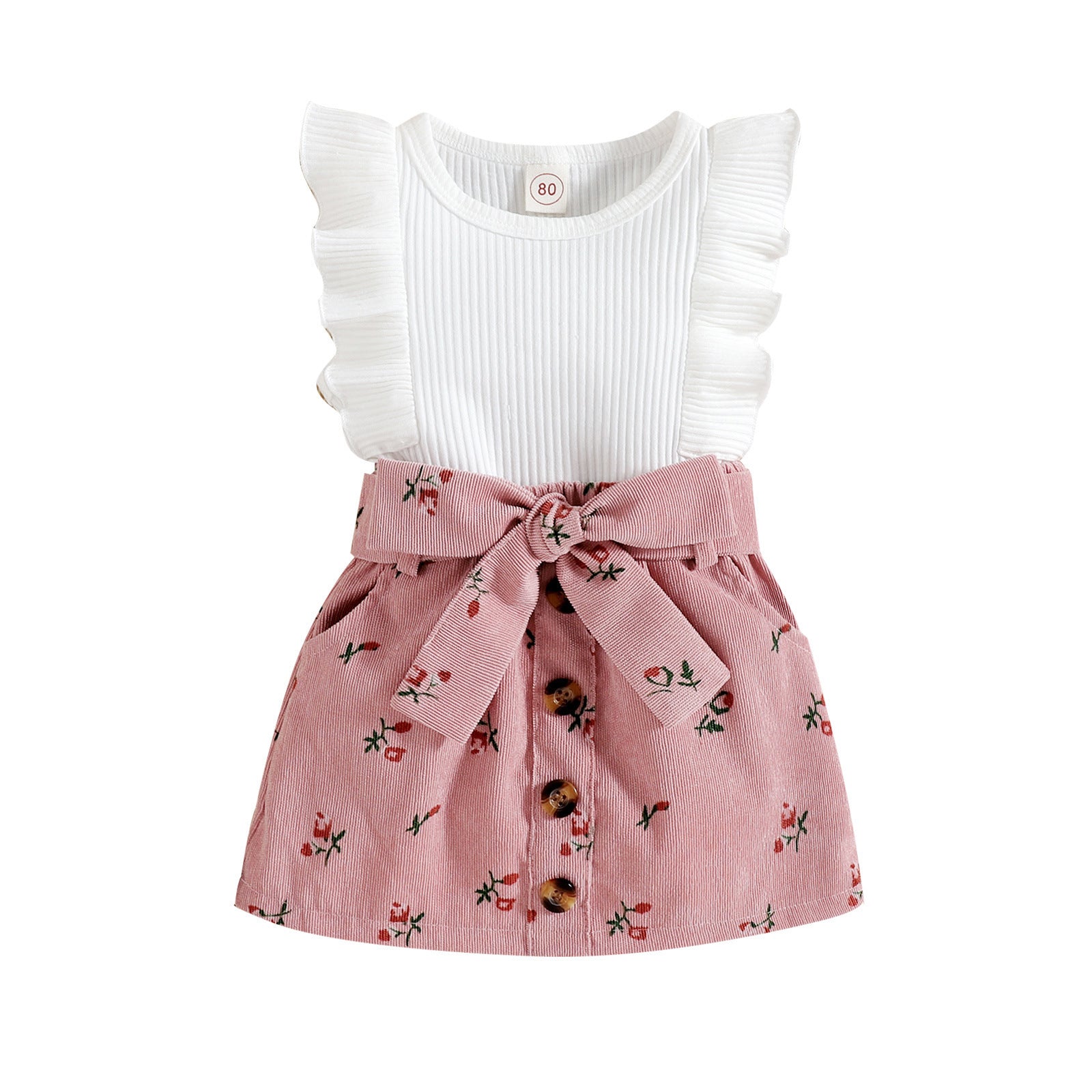 Pit Stripe Flare Sleeveless Floral Corduroy Skirt 2pc Set